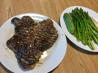 Suur 400 g T-bone steak, võis praetud spargel ja soolakurk