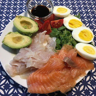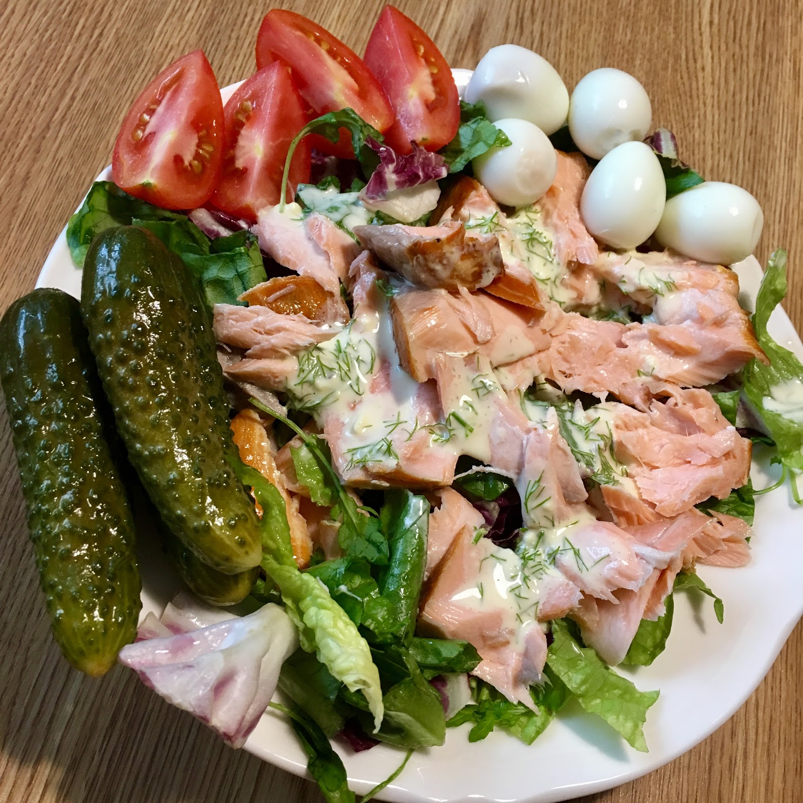 lehtsalat, kuumsuitsulõhe, vutimunad, tomat, soolakurk, majoneesikaste sidrunimahlag