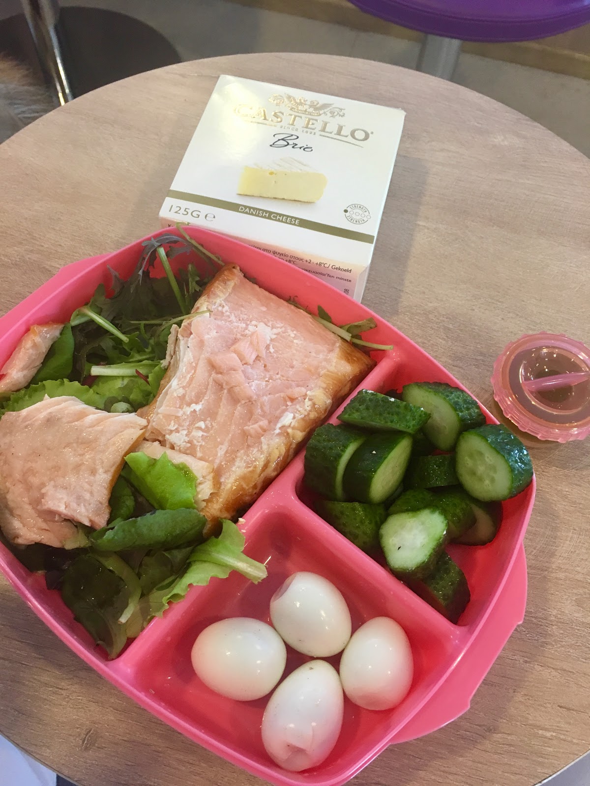 mesclun salat, kuumsuitsulõhe, vutimunad, soolakurk, avokaadoõli, brie juust