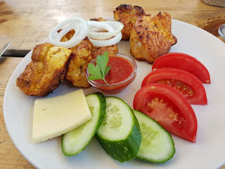 Pirosmani restorani kalkunišašlõkk, sulguni juust, sibul, tomat, kurk (ketšupit ei söönud)