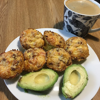 kukeseene omletuffinid singi, juustu, tomati ja sibulaga, avokaado, must kohv